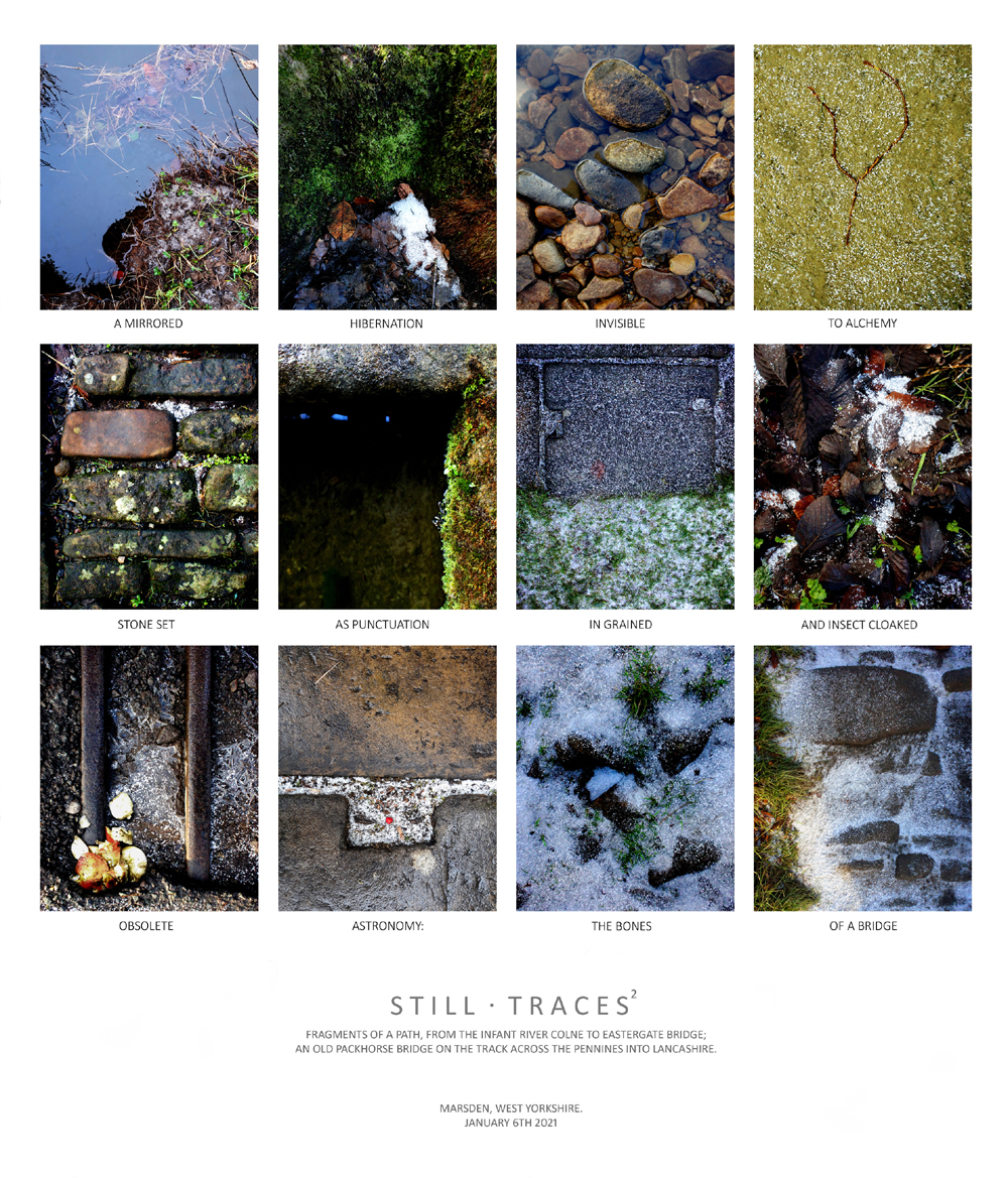 12 sequential images of the ground, taken during a walk from the infant river Colne, west of Marsden, to Eastergate Bridge;