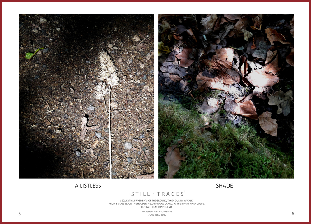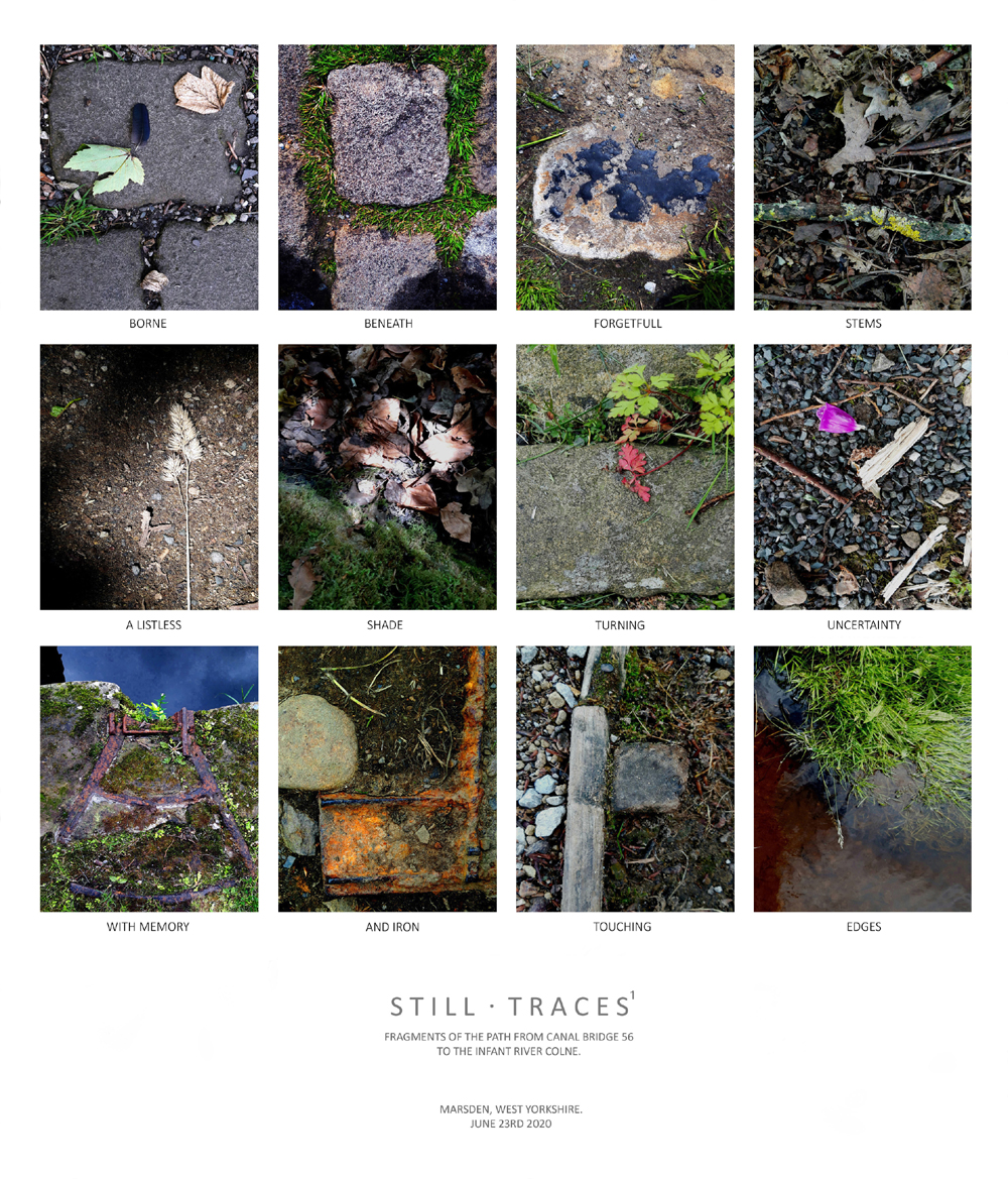 12 sequential images of the ground, taken during a walk from Bridge 56, on the Huddersfield Narrow Canal, to the infant river Colne above Marsden.