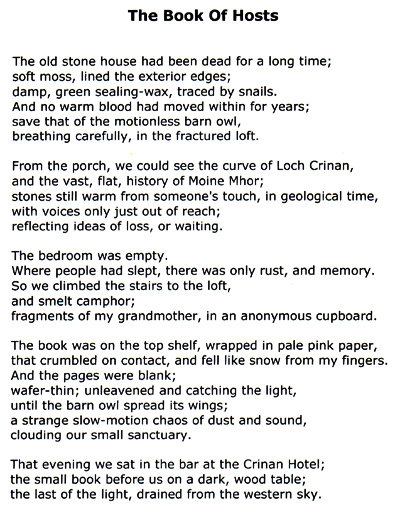 The idea for 'The Book Of Hosts' dates back to the mid 1980s; around the time of the other 'object' pieces such as 'The Dark Bulb' and 'The Bone Walking Stick'. However, while those and other pieces cost very little to make, The Book Of Hosts required a fairly substantial outlay, if it was to made in the way I had envisaged it. Finding consecration wafers that would be large enough to make the blank pages was also a major problem back then - before the days of the internet and search engines - but the major cost involved would be the creation of an embossed leather book-cover and spine; something that really needed to be done by a professional bookbinder. And so it was that the idea lay dormant in a notebook for nearly thirty years, until I finally had the both the finance and the information sources to assemble its component parts. The house in the story does exist; as does the small bar to the side of the Crinan Hotel; where evenings have been spent reflecting on the light of Loch Crinan and the passing of time. |