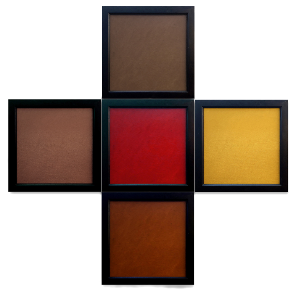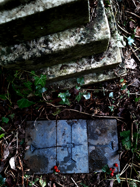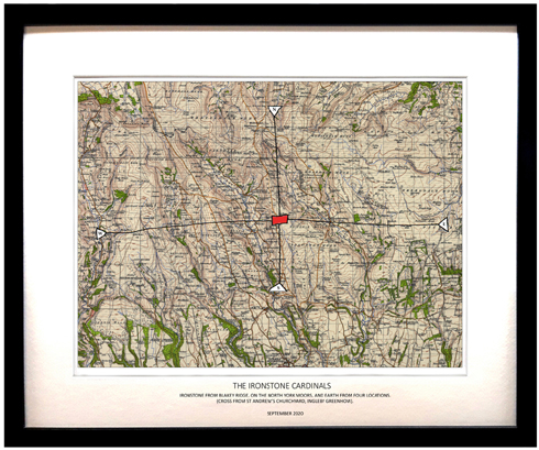 The central section of this piece is a canvas panel stained with a pigment I made using ironstone rocks from the North York Moors; small pieces I found near the old Sheriff's Pit mine, just east of Blakey Ridge. The other four panels are canvas stained with earth; earth collected from the four locations indicated by the cross on the map: one to the north; one to the south; one to the east; and one to the west; of the central location that yielded the ironstone rocks. The four cardinal points of the compass. The cross on the map - indicating the points at which the ironstone and the earth were to be collected - was found engraved onto three small pieces of slate, in the churchyard of St Andrew's in Ingleby Greenhow; a village on the western edge of the moors, and a place that has strong associations to the old ironstone industry that once dominated in the area. The small, three-piece slate cross can be found near a broken, stepped stone plinth, on the right, at the end of the path leading south-west from church porch doorway towards a small brook. |
