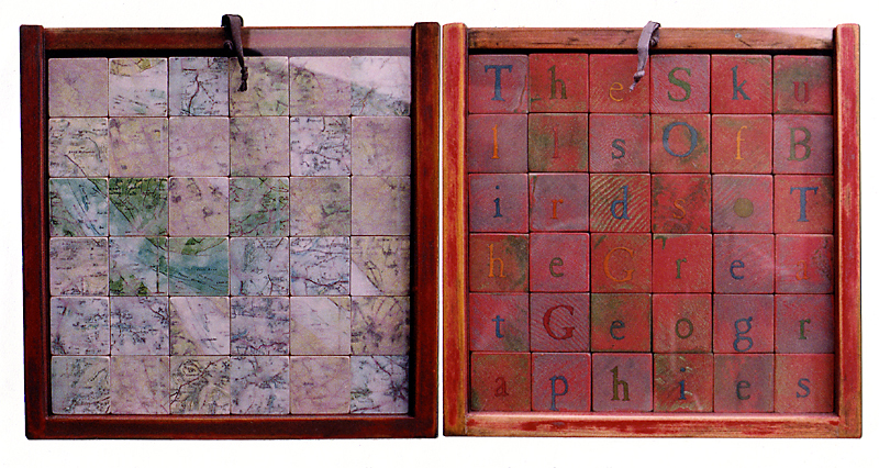 'The skulls of birds; the great geographies', are two 'partly remembered' lines from a Ted Hughes poem of 1962; the originals being: 'skull of a bird, whose great geographies'. I discovered it in a Penguin anthology of poetry called 'Worlds', published in 1974; a book containing work by severn contemporary writers; including Seamus Heaney and Adrian Mitchell as well as Ted Hughes. The words struck me as a wonderfully elegant encapsulation of a very elusive idea; the magical way that something as fragile as a bird can navigate vast landscapes and oceans during migration. The dislocated 'map', is of the Humber Estuary. 'Dislocated', as a reference to the dual identity of skulls; at one and the same time, a place for thought and inteligence; but also, in death, a vacated shell of memory. With the slightly childlike wooden cubes that spell out the words, an echo of the innocence and playfulness I always associate with birds. A serious misinterpretation of nature's quite ruthless regime I know, but also a foil to the darker side of 'skull'.
